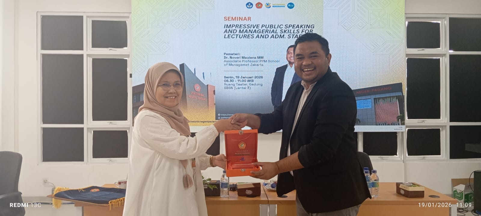 Padang, 19 Januari 2026 — Politeknik Negeri Padang (PNP) menyelenggarakan seminar bertajuk “Impressive Public Speaking and Managerial Skills for Lecturers and Administrative Staff” yang diperuntukkan bagi dosen dan tenaga kependidikan. Kegiatan ini dilaksanakan sebagai upaya peningkatan kompetensi komunikasi dan manajerial sumber daya manusia di lingkungan Politeknik Negeri Padang.